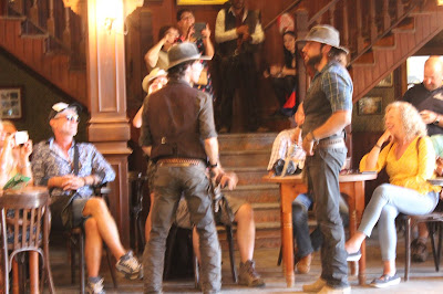 En el salón, recrean peleas entre buenos y malos para los turistas.